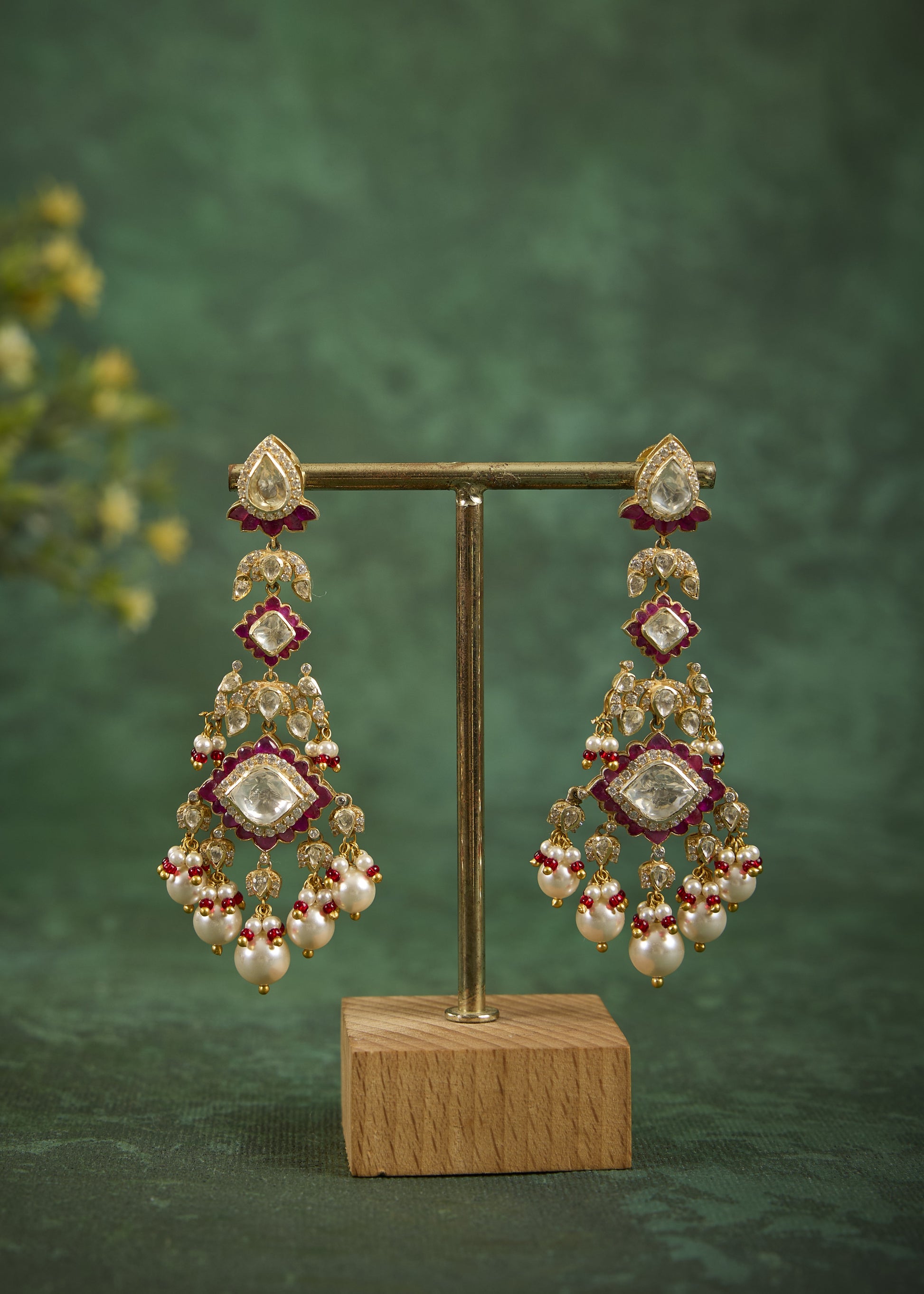 Composition: Vellore Polki, Semi Precious Ruby, CZ Diamond, Fresh Water Pearls with Gold Foil & 92.5 Silver