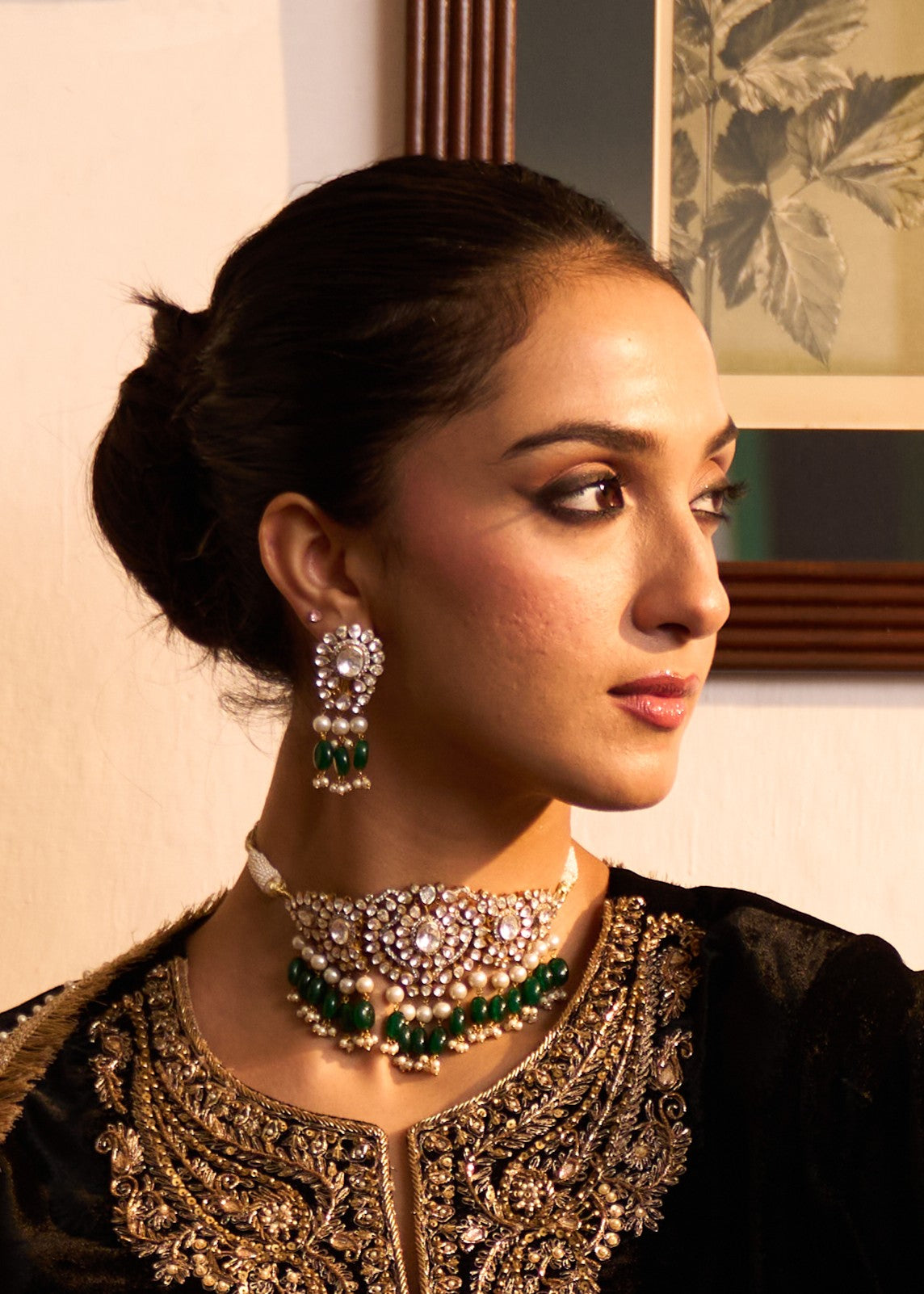 Composition: Vellore Polki, Semi Precious Emerald , CZ Diamonds, Fresh Water Pearls, Gold Foil & 92.5 Silver