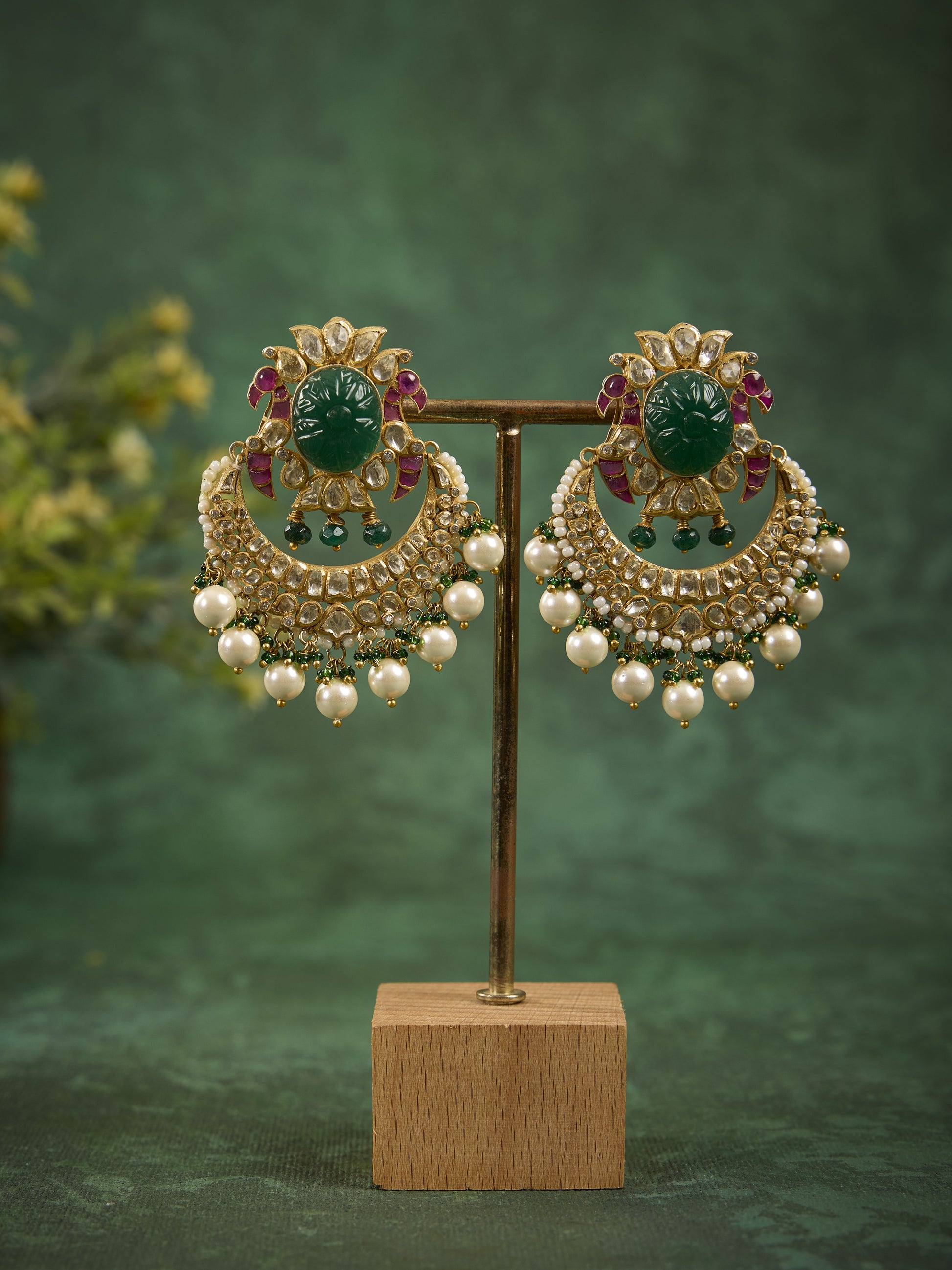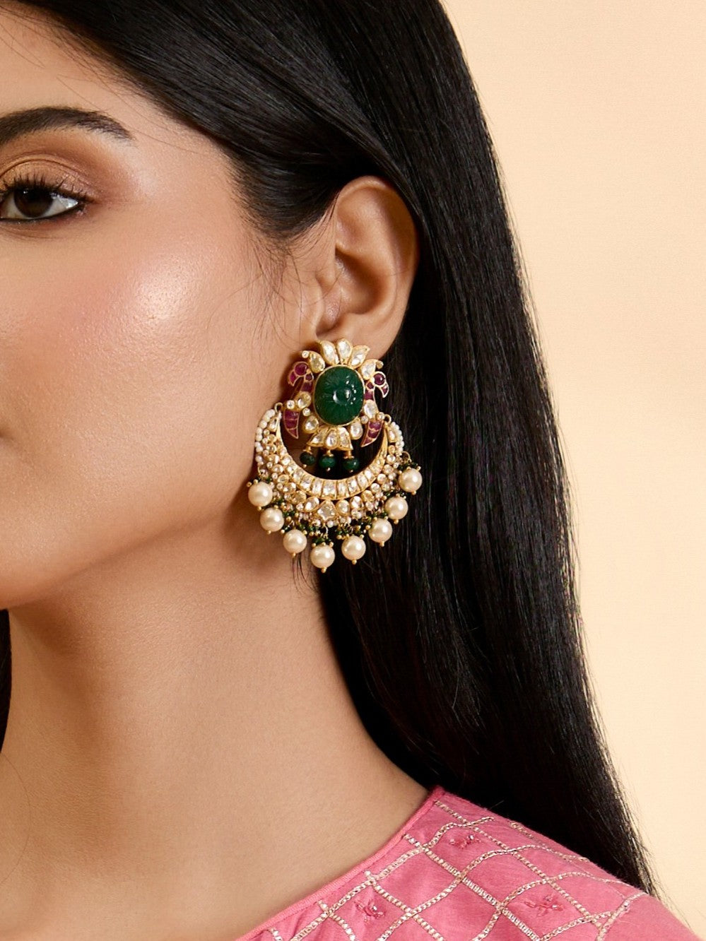 Featuring an 18kt Gold Plated 92.5 Silver Vellore Polki Earrings with Red Utrai , Green Stone & Fresh Water Pearls
