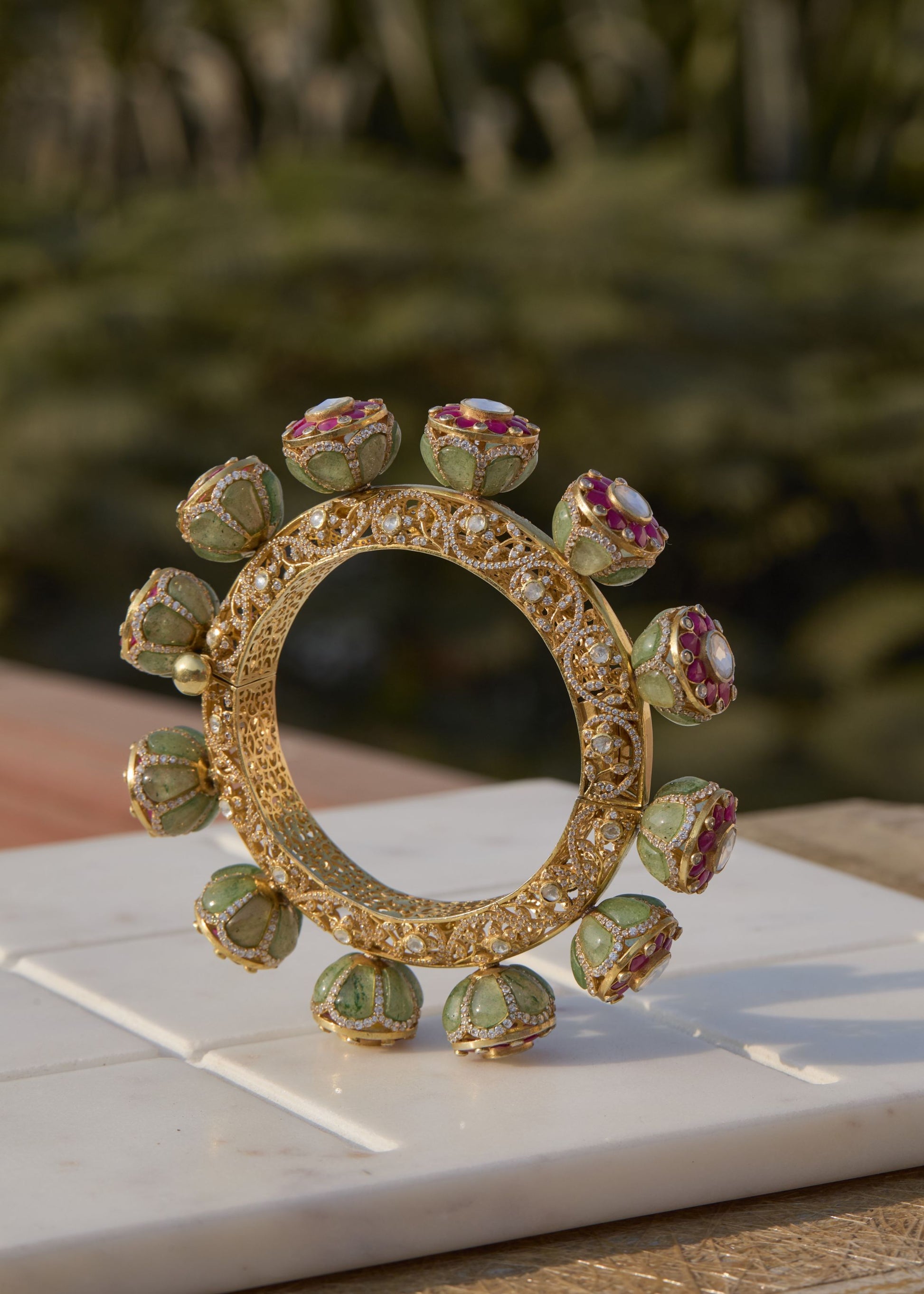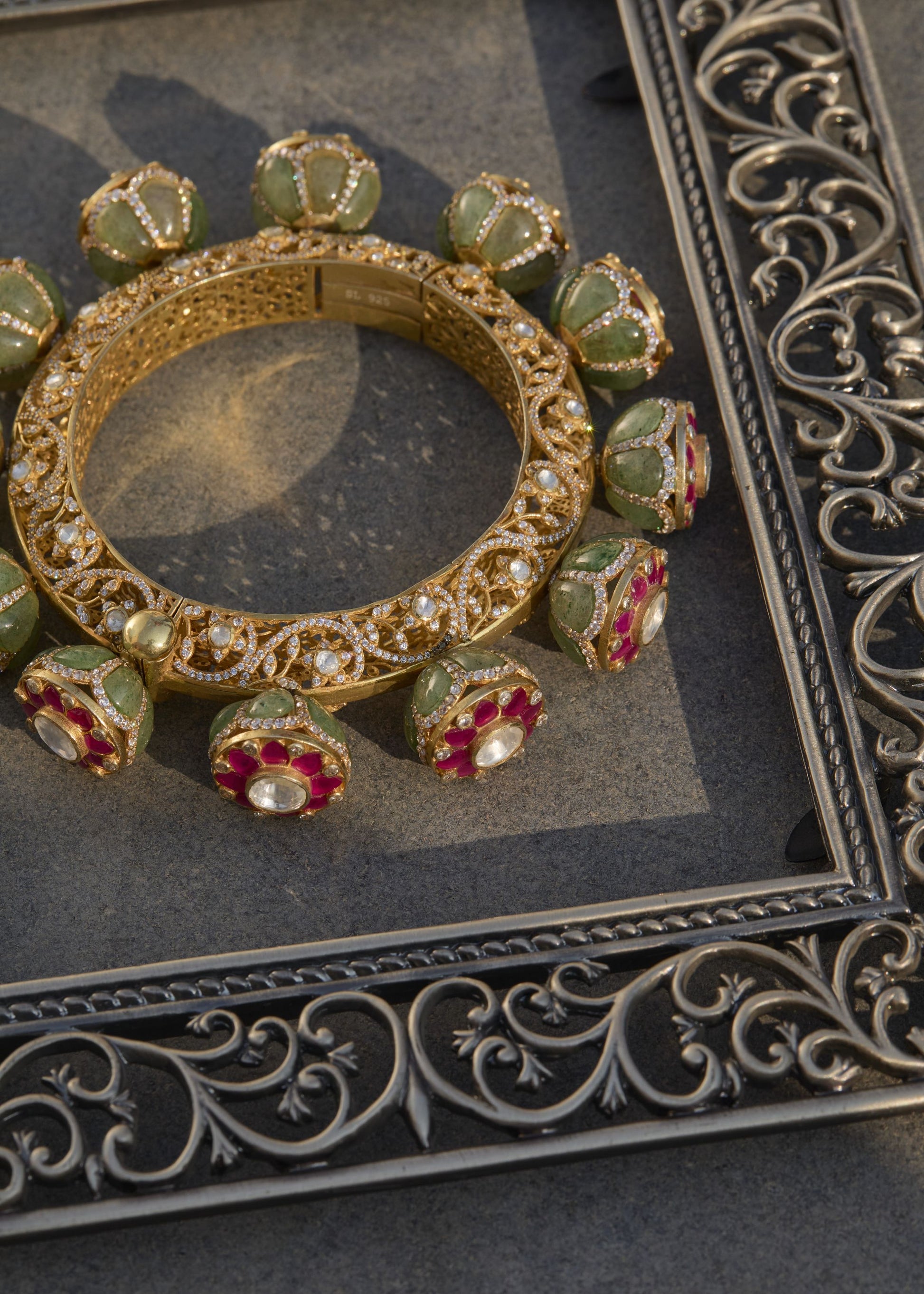 Featuring An 18Kt Gold Plated 92.5 Silver Polki Kada With Green & Red Utrai & CZ Diamonds