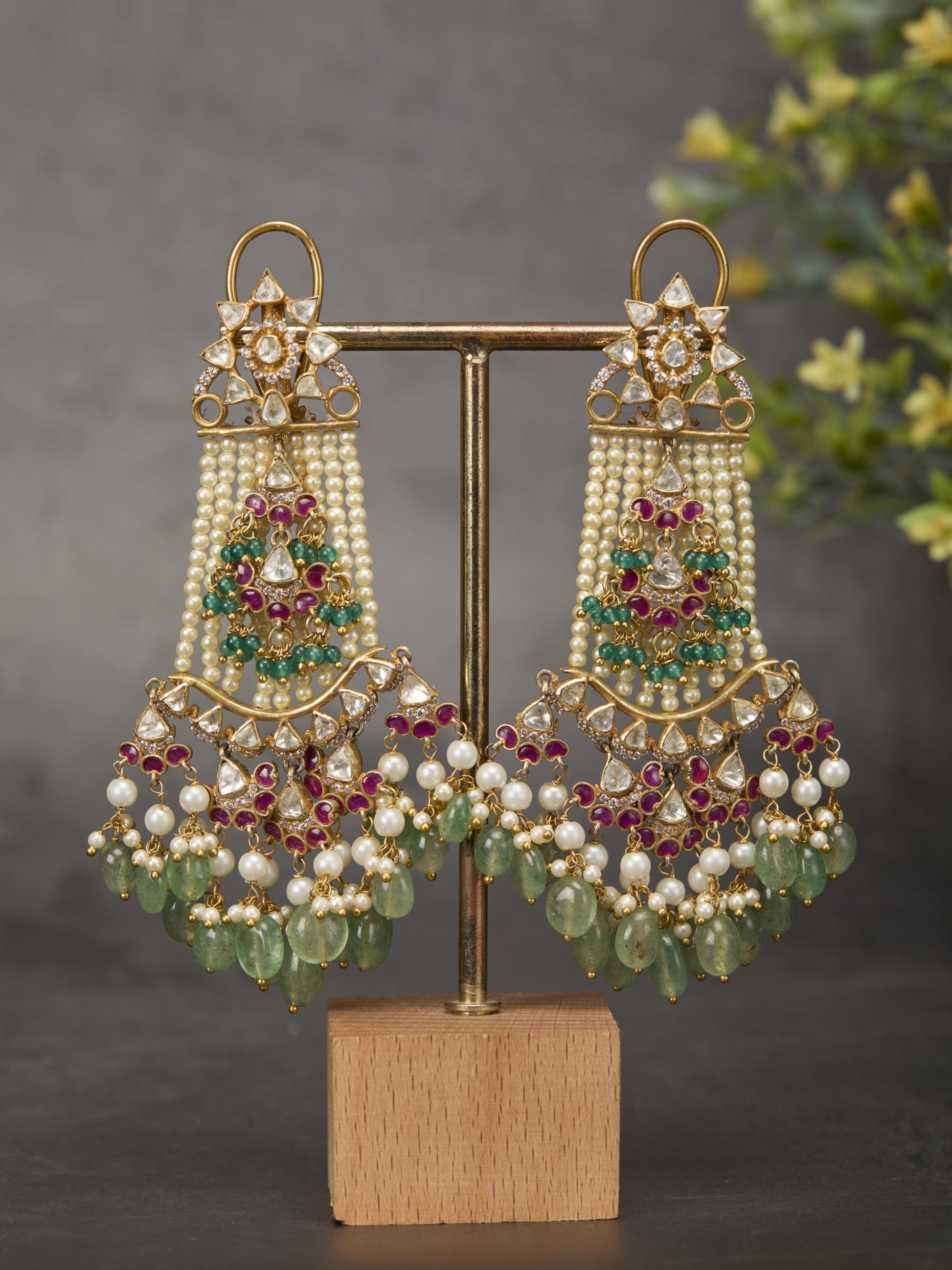 Featuring an 18kt Gold Plated 92.5 Silver Earring With Vellore Polki, Red Utrai, Green Drops & Fresh Water Pearls
